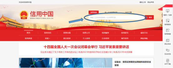 一、登录“信用中国”网站(www.creditchina.gov.cn),在网站首页顶端查询栏输入企业名称或统一社会信用代码。