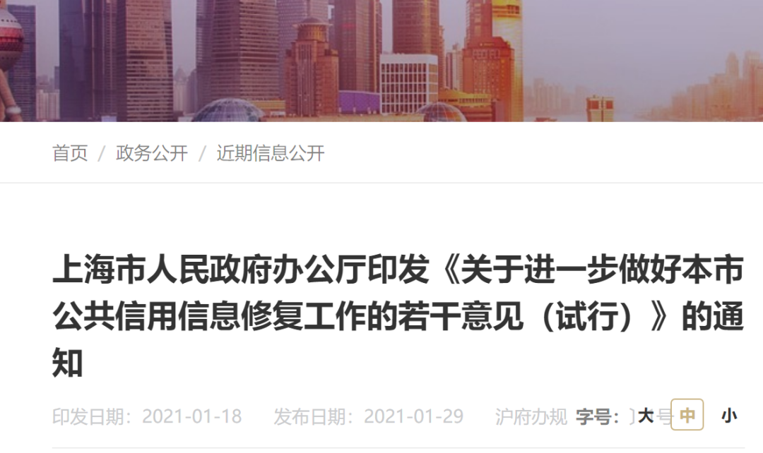 沪府办规〔2021〕1号上海市人民政府办公厅印发《关于进一步做好本市公共信用信息修复工作的若干意见(试行)》的通知各区人民政府,市政府各委、办、局:经市政府同意,现将《关于进一步做好本市公共信用信息修复工作的若干意见(试行)》印发给你们,请认真按照执行。 上海市人民政府办公厅 2021年1月15日关于进一步做好本市公共信用信息修复工作的若干意见(试行)为加快推进本市社会信用体系建设,保障信用信息主体权益,优化全市营商环境,根据《国务院办公厅关于进一步完善失信约束制度构建诚信建设长效机制的指导意见》(国办发〔2020〕49号)、《国家发展改革委办公厅关于进一步完善“信用中国”网站及地方信用门户网站行政处罚信息信用修复机制的通知》(发改办财金〔2019〕527号)和《上海市社会信用条例》,现就进一步做好本市公共信用信息(以下简称“信用信息”)修复工作提出若干意见如下:一、明确修复范围鼓励信用信息主体通过主动改正失信行为、消除不良社会影响等方式修复失信信息。信用信息主体可就自身被归集至市公共信用信息服务平台、各区信用平台的下列信息申请修复:欠缴依法应当缴纳的税款、社会保险费、行政事业性收费、政府性基金的信息;提供虚假材料、隐瞒真实情况,侵害社会管理秩序和社会公共利益的信息;拒不执行生效法律文书的信息;适用一般程序作出的行政处罚信息;法律、法规和国家规定的其他信息。 经营异常名录和严重失信主体名单的修复,依照相关行业主管部门规定的条件、程序等要求执行,符合修复条件的,相关部门和单位要按照规定及时移出名单。移出后,可按照本意见规定进行信用信息修复。人民法院裁定批准破产重整计划、依法直接批准破产重整计划草案或裁定认定和解协议的案件,破产重整企业存在失信信息的,债务人的管理人可持人民法院出具的批准重整计划裁定书、批准重整计划草案裁定书或认可和解协议裁定书申请修复相关失信信息。人民法院归集的裁判文书和失信被执行人信息按照最高人民法院有关司法解释执行。 二、依法确定修复主体信用信息修复工作实行信息“谁产生,谁修复”的原则,由原失信信息提供单位(即原行政行为作出单位)负责信用信息修复申请的受理、审查、决定、意见反馈和信用信息主体知情权保障等工作。 三、准确把握修复条件 按照失信行为造成后果的严重程度不同,失信信息修复分别适用以下情形,法律法规规章有规定的从其规定:(一)情节轻微、社会危害性较小的失信行为信息,修复应符合以下条件:已改正失信行为、消除社会不良影响;作出信用承诺。修复申请提起时,应距原行政行为作出之日满三个月。(二)情节较严重、有一定社会危害性的失信行为信息,修复应符合以下条件:已改正失信行为、消除社会不良影响;作出信用承诺。修复申请提起时,应距原行政行为作出之日满六个月。申请修复行政处罚信息的,已按照国家要求参加信用修复培训并提交信用报告。(三)涉及以下特定严重失信行为的信息,在五年查询期限内不可修复: 1.在食品药品、生态环境、工程质量、安全生产、消防安全、强制性产品认证等领域被行政机关处以责令停产停业、吊销许可证、吊销执照或者行政拘留的行政处罚信息。2.因贿赂、恶意逃废债务、恶意拖欠货款或者服务费、恶意欠薪、非法集资、合同欺诈、传销、无证照经营、制售假冒伪劣产品和故意侵犯知识产权、出借和借用资质投标、围标串标、虚假广告、侵害消费者或者证券期货投资者合法权益、严重破坏网络空间传播秩序、聚众扰乱社会秩序等行为,被行政机关处以责令停产停业、吊销许可证、吊销执照或者行政拘留的行政处罚信息。 3.法律、法规、规章规定不可修复的其他信息。 四、严格遵守修复流程各部门、各单位要将失信信息修复工作纳入“一网通办”。为确保失信信息修复工作合法、审慎、有效、及时开展,要严格按照下列程序操作: (一)提出申请信用信息主体可通过“一网通办”网站,或者直接向原失信信息提供单位提出申请。申请时,应提交信用信息修复申请表、身份证明登记证件复印件(加盖公章,自然人应签名)、信用信息修复承诺书、改正失信行为和消除不良影响的证明材料以及行业主管部门规定的其他材料。信用信息主体还可选择通过“信用中国(上海)”网站或者前往市公共信用信息服务中心提交修复申请。信用信息主体通过“一网通办”“信用中国(上海)”网站,或者市公共信用信息服务中心提交申请的,市公共信用信息服务中心应在收到申请后1个工作日内,将申请材料转交原失信信息提供单位。 (二)申请受理原失信信息提供单位在收到材料后,应在2个工作日内审查申请文件的完整性和规范性,并决定是否受理。申请材料不齐全或形式不符合要求的,原失信信息提供单位应一次性告知申请人补正相关材料,补正后符合要求的,予以受理。 (三)修复认定原失信信息提供单位应对申请材料进行核查,自受理之日起5个工作日内作出是否予以修复的决定,并书面告知信用信息主体。情况复杂,不能在规定期限内办结的,可以适当延长,但是延长期限最多不超过3个工作日,延期情况需及时告知信用信息主体和市公共信用信息服务中心。原失信信息提供单位在完成审查后,要及时