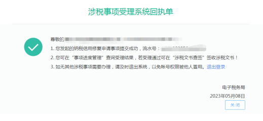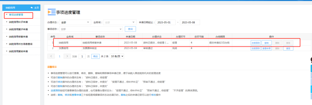 ⑤可通过【纳税信用】目录下的【事项进度管理】,查询信用修复申请的办理情况。