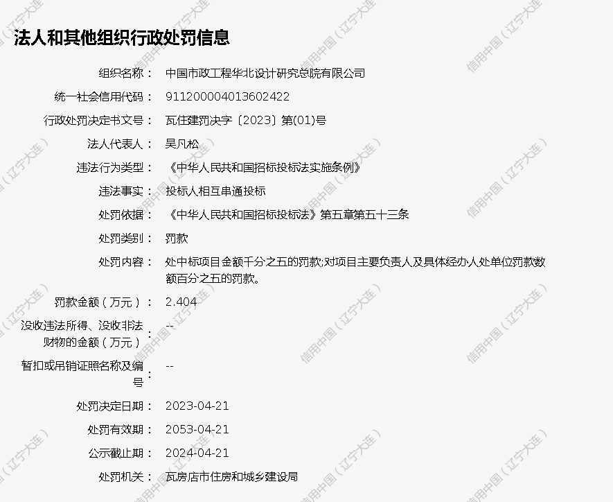 中国市政工程华北设计研究总院有限公司因投标人相互串标,被瓦房店市住房和城乡建设局进行行政处罚。