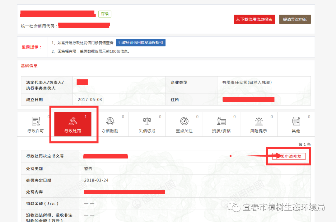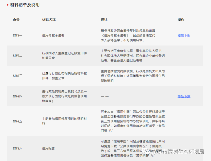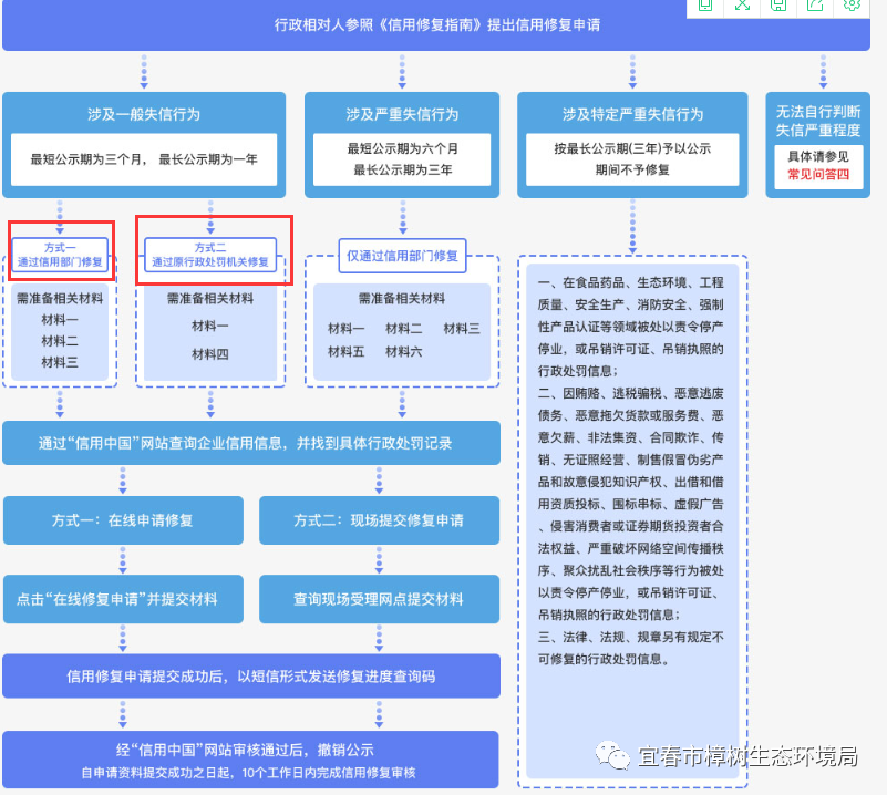 (2)通过原行政处罚机关修复:通过作出该行政处罚决定的部门修复,需要提交材料一、材料四)