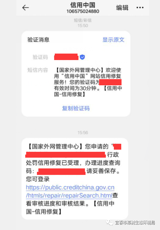 提交后,信用受损企业将会收到短信通知提醒,可根据短信通知查询当前处理进度,界面如下: