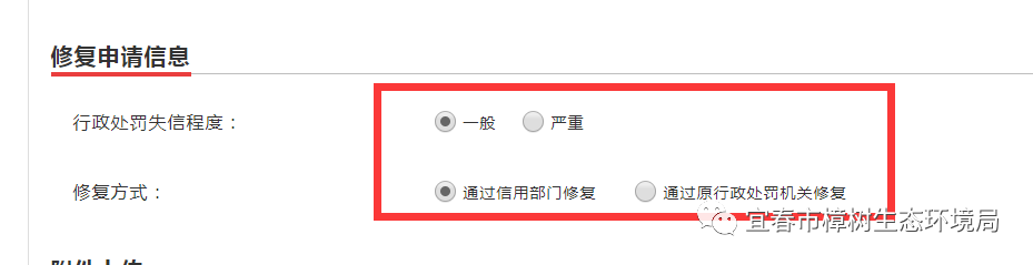 第六步:填完后,继续将页面下拉,修复申请信息根据行政处罚的定义来选择,修复方式可选择通过“信用部门修复”或者“通过原行政处罚机关修复”,