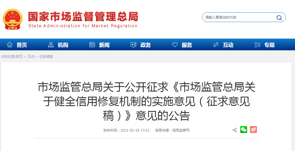 市场监管总局关于健全信用修复机制的实施意见(征求意见稿)各省、自治区、直辖市及新疆生产建设兵团市场监督管理局(厅、委):健全信用修复机制是党中央、国务院深化“放管服”改革的必然要求,是优化营商环境的重要举措,是市场主体信用体系建设的重要内容。根据《关于进一步完善失信约束制度构建诚信建设长效机制的指导意见》(国办发〔2020〕49 号)等文件精神,现就健全市场监督管理部门信用修复机制,提出如下意见: