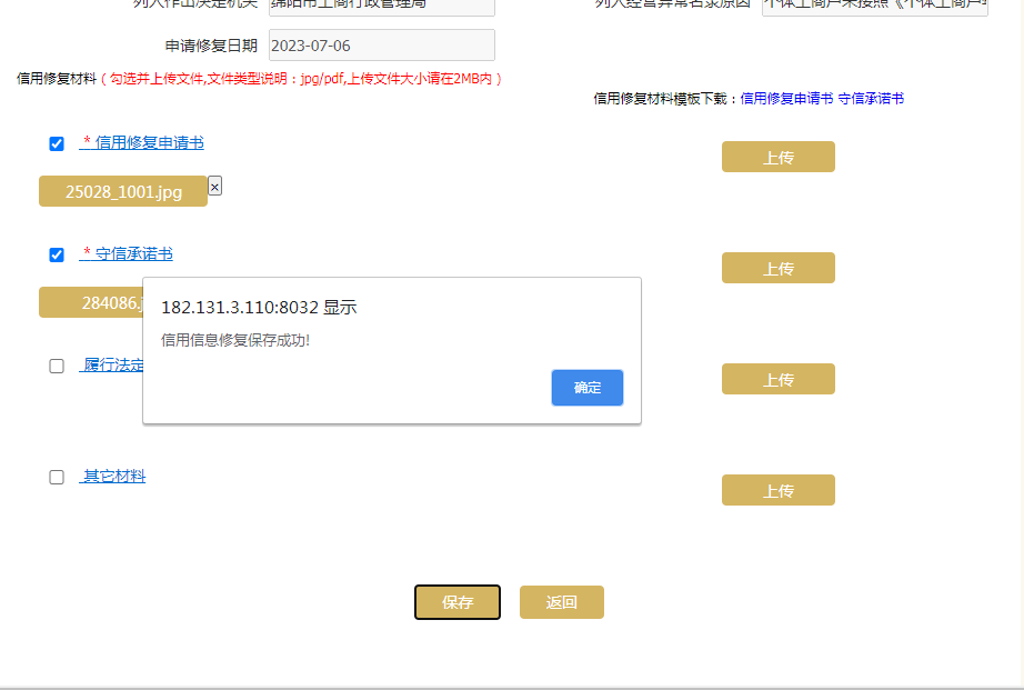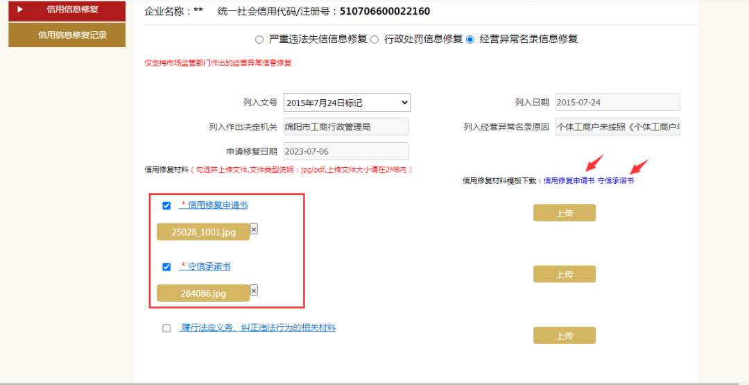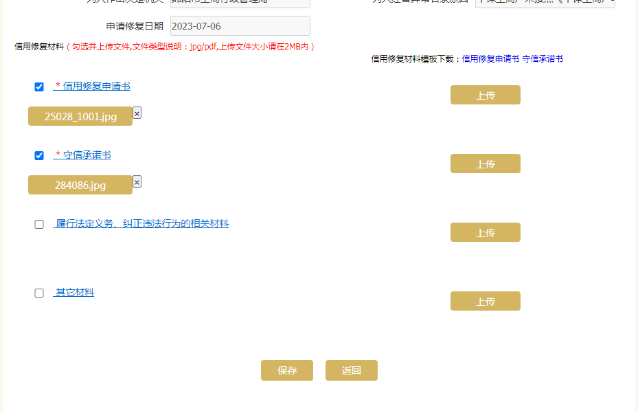 2选择想要修复的文号,勾选并上传信用修复材料,并保存,提交后由市监局审核;信用修复申请书和守信承诺书均必传,上传的文件要是jpg/pdf格式,大小请在2MB内;模版点击“信用修复申请书”、“守信承诺书”下载。