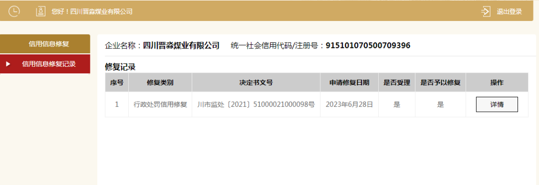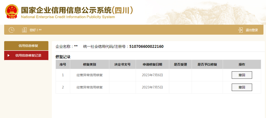1点击信用信息修复记录,可以查询提交的所有申请记录,提交后如发现内容填写错误的,可以点击撤回,重新填写。