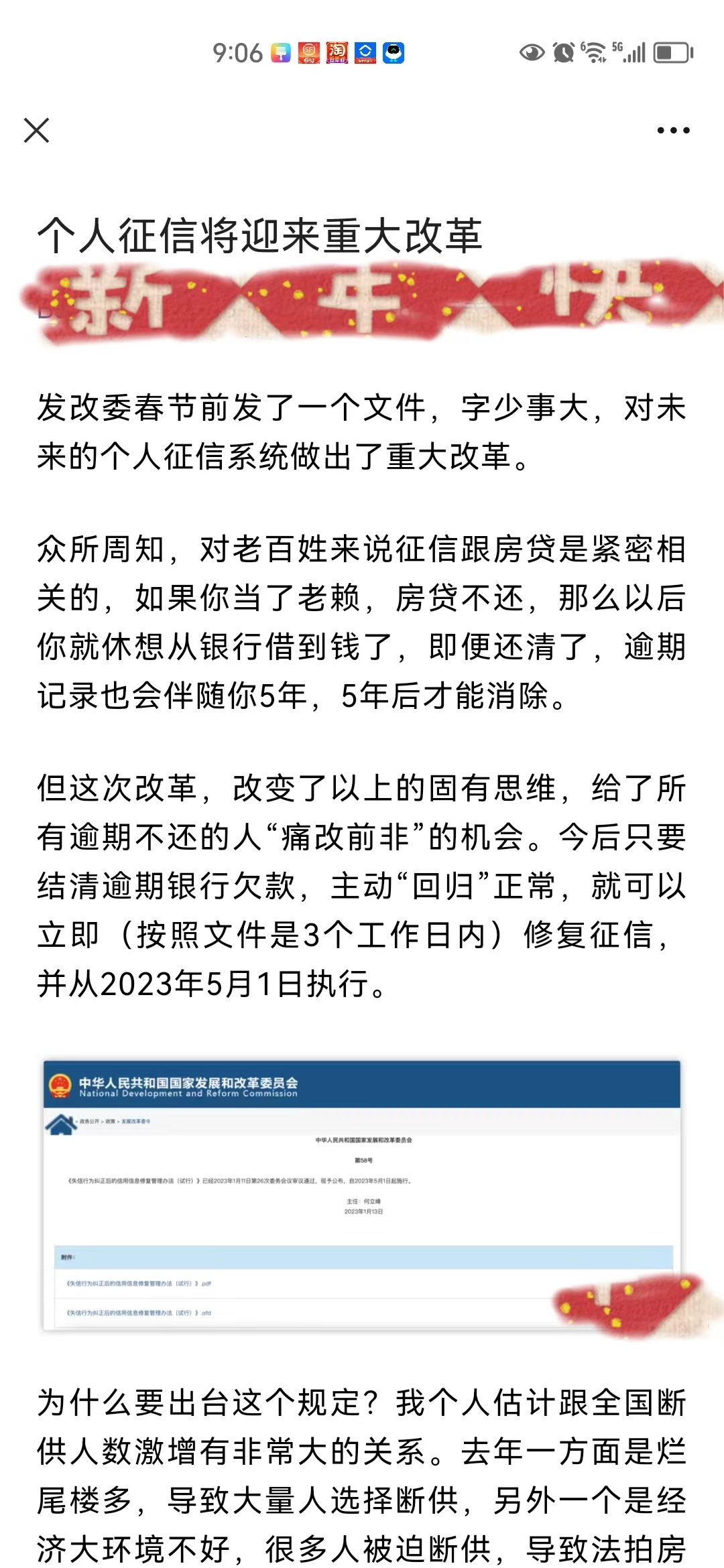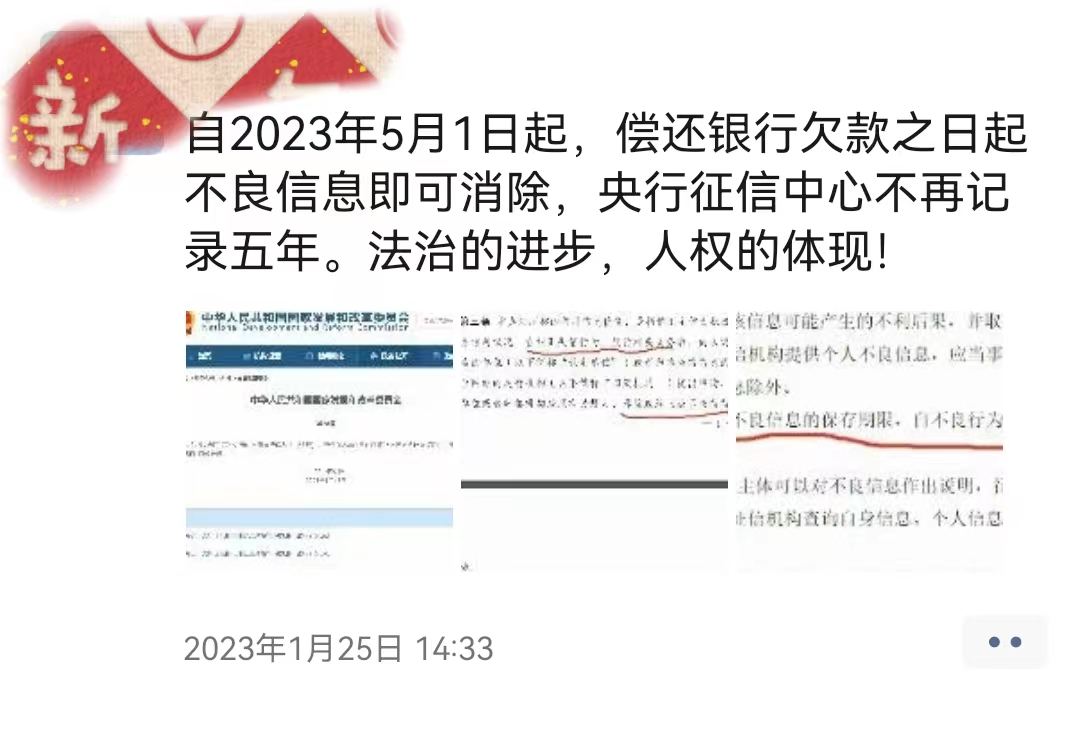 事情起因是国家发改委前阵子发布了第58号令文件《失信行为纠正后的信用信息修复管理办法(试行)》,今年5月1日开始实施。《办法》的确提及,信用主体依法享有信用信息修复的权利。“信用主体为积极改善自身信用状况,在纠正失信行为、履行相关义务后,向认定失信行为的单位或者归集失信信息的信用平台网站的运行机构提出申请,由认定单位或者归集机构按照有关规定,移除或终止公示失信信息。”光读这些文字,的确容易造成误解。很多人立马联想到之前个人征信记录不良信息要保存5年呢。难不成《办法》一出,逾期信贷还上了,征信污点不用等5年就消除了?不是的不是的。此“信用”非彼“信用”,此“信用信息”也非彼“征信信息”,因此此“信用修复”也非彼“征信修复”。因为这儿是发改委管的,信用主体主要是针对企业们的,所谓失信,也是经营意义上的;那儿呢是央行管的,个人征信记录也是金融机构送报到央行那儿的,所谓失信,是信贷意义上的。后者,没有新政,没有变化。要说“征信修复”,除非当事人的个人征信报告真的被记录错误了,那么当然可以提交异议申请,否则,个人征信不能被修复,只能乖乖等它5年后自动消除。央妈及其多地分支已经多次对外表达,那些号称可以帮忙操作征信修复的,都是骗局,是黑灰产。嗯,请远离。