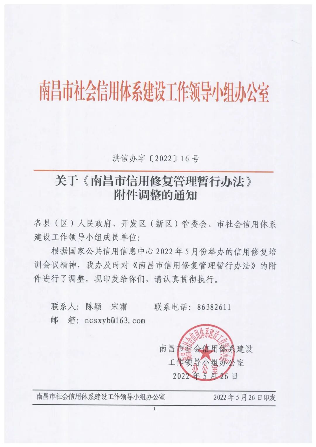 关于《南昌市信用修复管理暂行办法附件调整的通知》