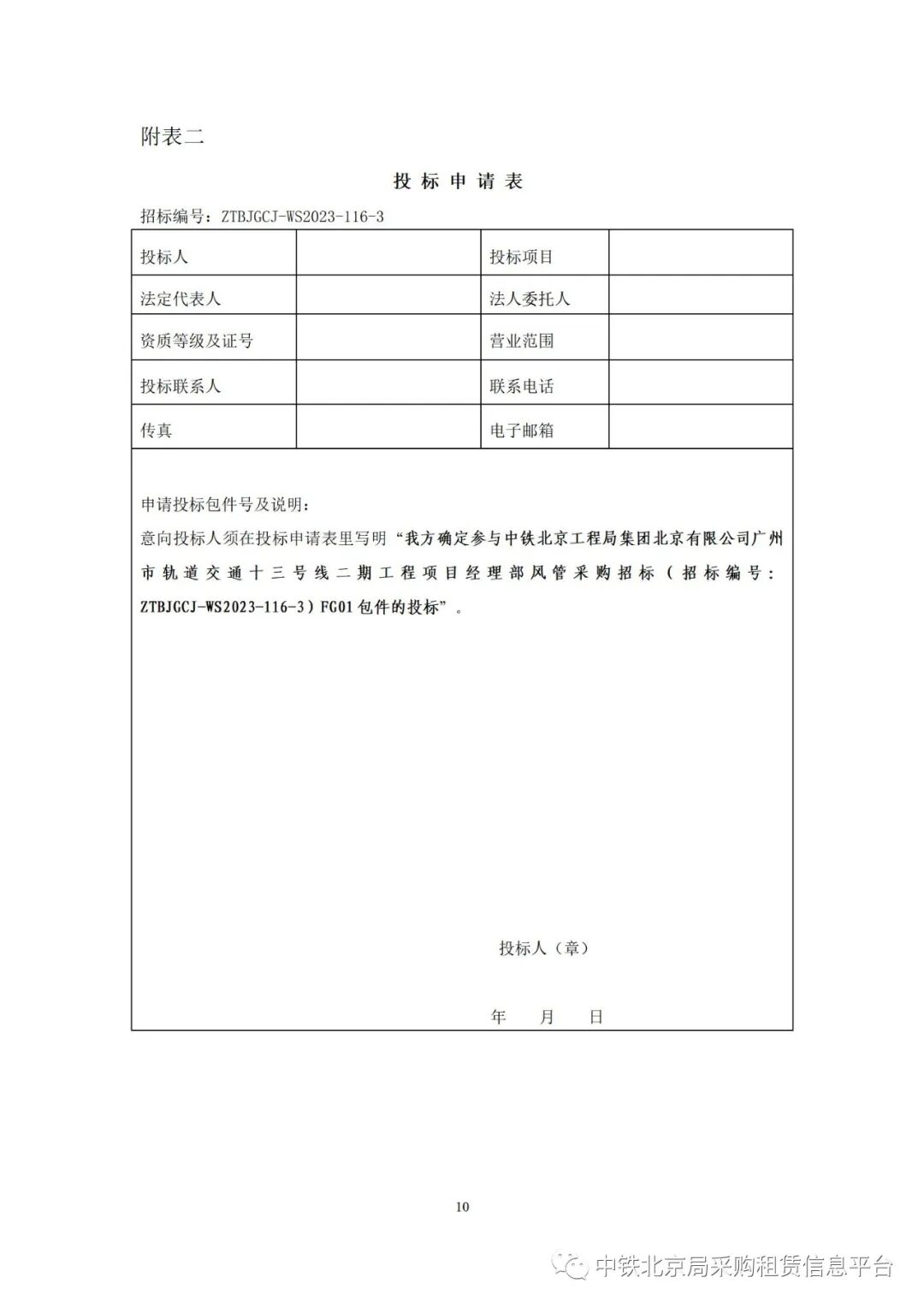 5.2.3购买招标文件: 凡有意参加投标的潜在投标人,请于2023年10月19日 9时00分至2023年10月25日 17时00分前(节假日除外)将投标申请表(附表二)、营业执照副本(加盖公章)、投标联系人身份证扫描件(加盖公章)、标书款银行回执单扫描件以电子文档形式发送至邮箱zhaobiao@ztbjj-wm.com)。潜在投标人根据所需购买包件的招标文件售价以足额现金方式转入到招标组织人指定账户(账户名称:中铁北京工程局集团有限公司,开户行名称:中国邮政储蓄银行股份有限公司北京丰台区大红门服装城支行,账号:911002010003396939)并在汇款单上注明广州市轨道交通十三号线二期工程项目+2023-116-3+FG01包件标书款,汇款单位名称与投标人名称须完全一致。招标组织单位收到信息核实后,潜在投标人登陆中国中铁采购电子商务平台(www.crecgec.com)获取电子版招标文件。招标文件每套售价详见附表一,招标文件售后不退。购买标书的费用不提供发票,可提供相应收据,标书费与投标保证金应分开汇入,否则影响保证金退还,未按照招标公告要求汇款造成的损失,由投标人自行承担。