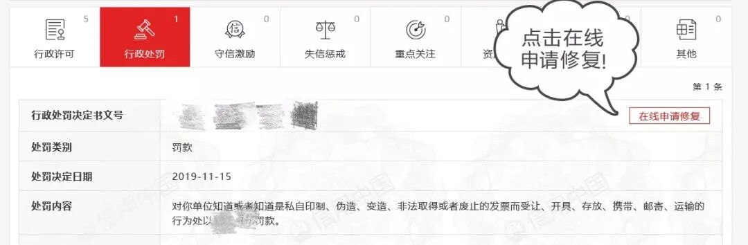 2 .点击行政处罚决定书文号后面的“在线申请修复”。