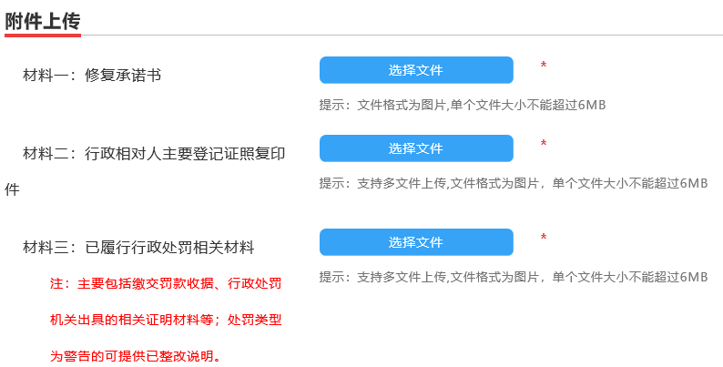 (1)信用修复承诺书原件。每条行政处罚申请修复时均须单独出具《信用修复承诺书》,且必须由法定代表人亲笔签字,不可使用名章。