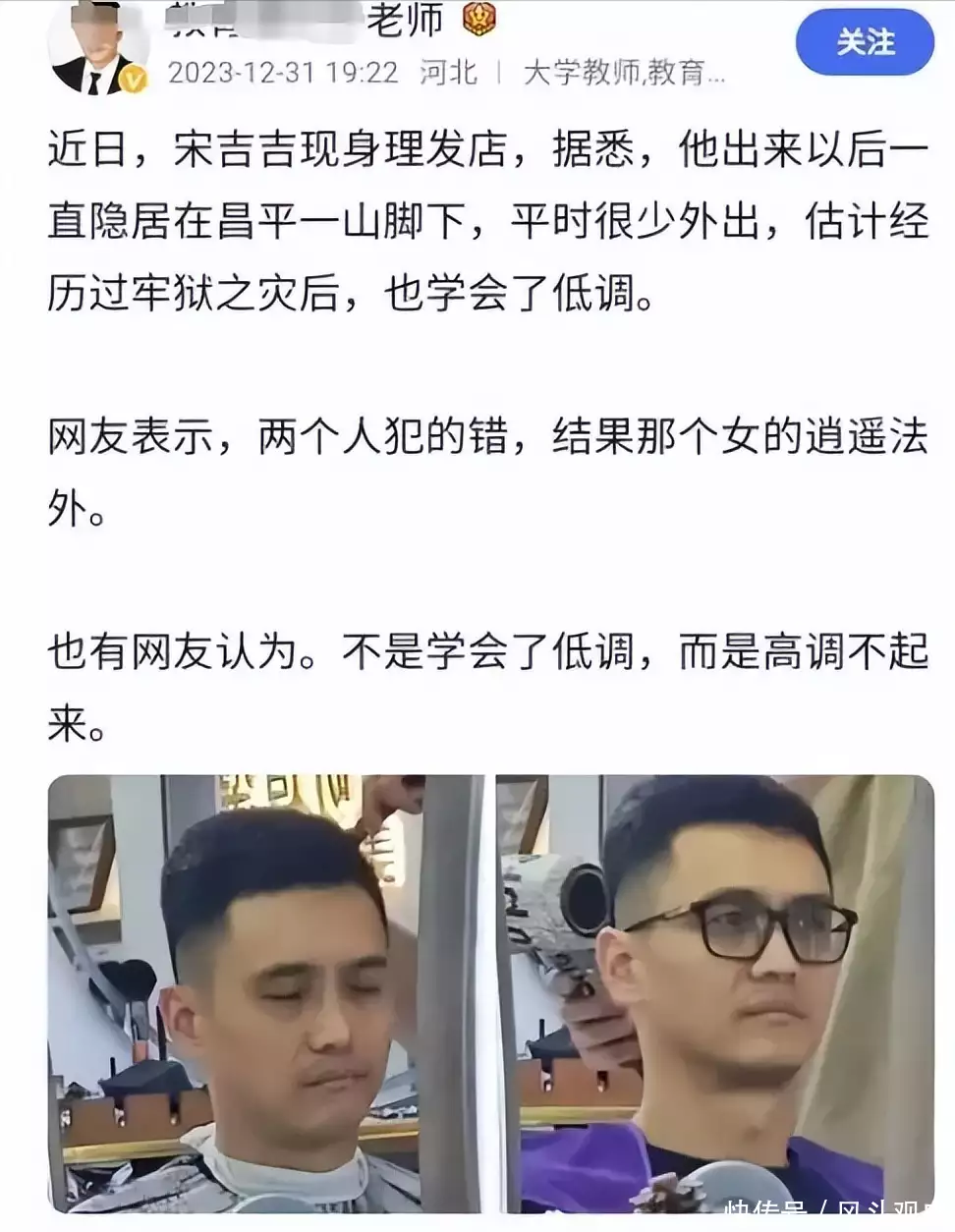 宋喆似乎很喜欢这样的短发,入狱前也是这样的装扮,如今6年过去了,他还是让理发师剪成了昔日的模样,待一切修剪完毕后,宋喆再次戴上眼镜,仿佛让人感觉到那个曾经高调的宋喆回来了。